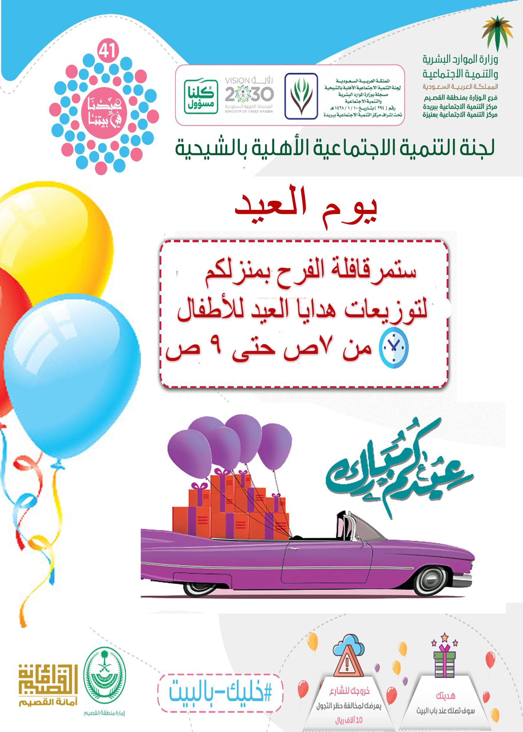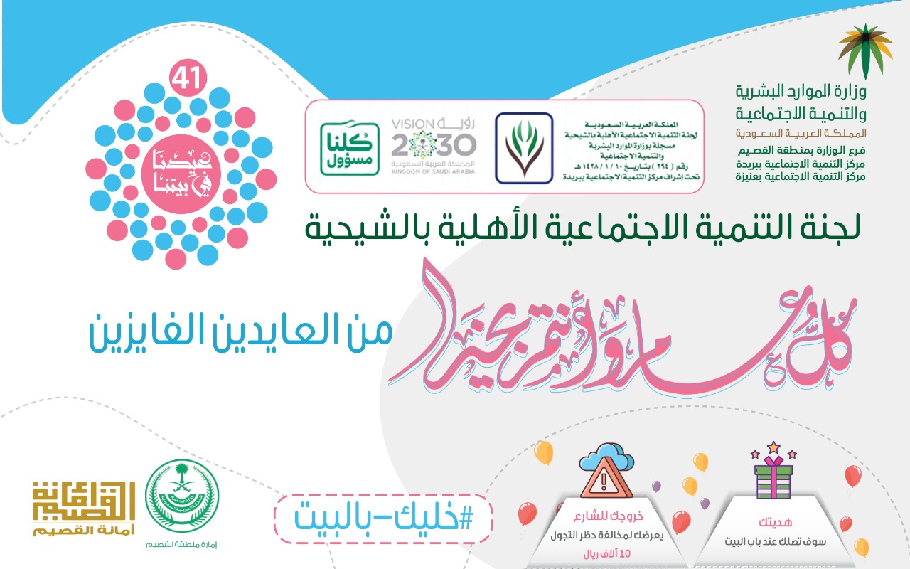 نفذت لجنة التنمية الاجتماعية الأهلية بالشيحية برنامج ( عيدنا في بيتنا ) 1/ وذلك من خلال توزيع عدد 1000 هداية على الأطفال المستفيدين من اللجنة داخل مركز الشيحية وأستراحات مركز الشيحية وتم توزيع الهدايا على منازل المستفيدين صباح يوم العيد . 2/ تم تفعيل مسابقة بمسمى ( المسابقة الأسرية عيدنا في بيتنا ) تم نشر الأسئلة صباح العيد الساعة 9ص وتم إغلاق الأجوبة الساعة 11ص وتم إعلان الفائزين في المسابقة الساعة 1م وكان عدد الفائزين بالمسابقة 50فائز لكل فائز علبة من الحلوي الشكولاته وتم تسليم الجوائز مساء يوم العيد على الفائزين بالمنازل .