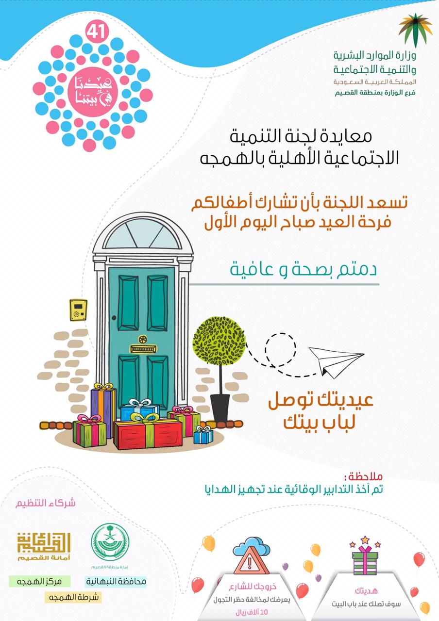 1 ـ توزيع هدايا العيد على منازل أحياء مركز الهمجة بالتعاون مع الشرطة ليلة العيد وأول أيام العيد 2 ـ مشاركة اجتماعية عبر مواقع التواصل الاجتماعي للجنة بعنوان ( جدارية عيدنا في بيتنا)