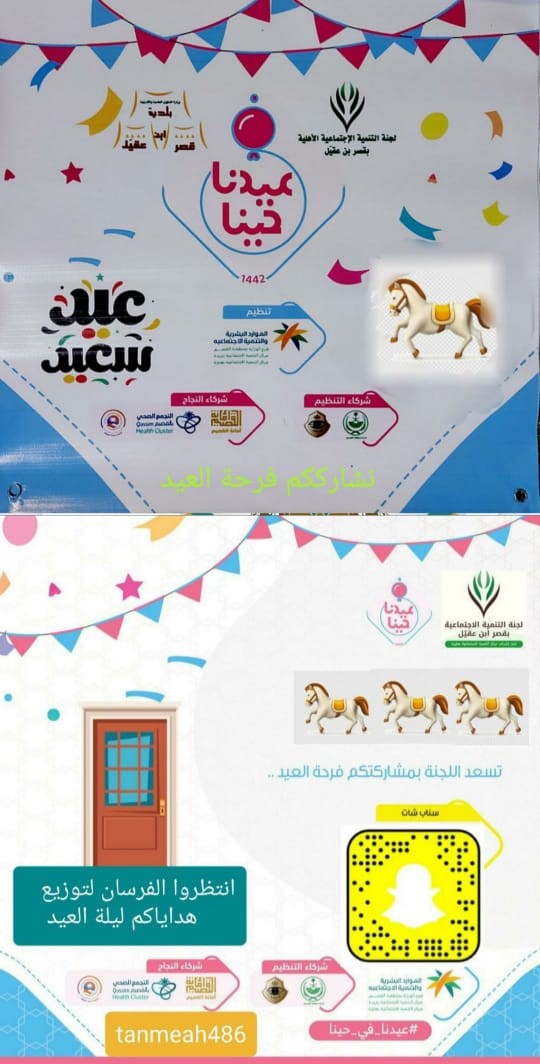 قامت لجنة التنمية الاجتماعية الأهلية بقصر ابن عقيل بتفعيل برنامج عيدنا في حينا ١٤٤٢ وتم توزيع الهدايا على الأطفال ليله العيد بالتعاون مع مربط الشفاء واللويحانية للخيول مما كان له عظيم الأثر في رسم البهجة والسرور على الأطفال والأسر بجميع الاحياء بمركز قصر ابن عقيل وفي اليوم الاول والثاني والثالث من عيد الفطر المبارك تم توزيع الهدايا على الأمهات في بيوتهن مما كان له الأثر العظيم على نفوسهن عند زيارة المتطوعات لهن والتقديم , ومعايدتهن وتقديم الهدايا كانن الامهات يهتفن بالدعوات. نسأل الله أن يوفقنا وإياكم لكل خير وان يديم على بلادنا نعمة الأمن والأمان تحت ظل قيادتنا الرشيدة .